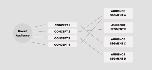 To make broad audiences effective, you need diverse creative concepts and numerous variants. Instead of customizing creatives for specific interests, you create broad concepts and test them against a variety of ad creatives. Meta uses the ads themselves to serve to different audience segments.