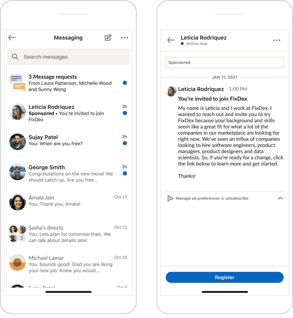 Message ads give you the ability to send a message to someone’s LinkedIn inbox, without the full conversation aspect. These are great for getting your message in from a warm prospect who’s familiar with you, and giving them a single and very clear call-to-action.