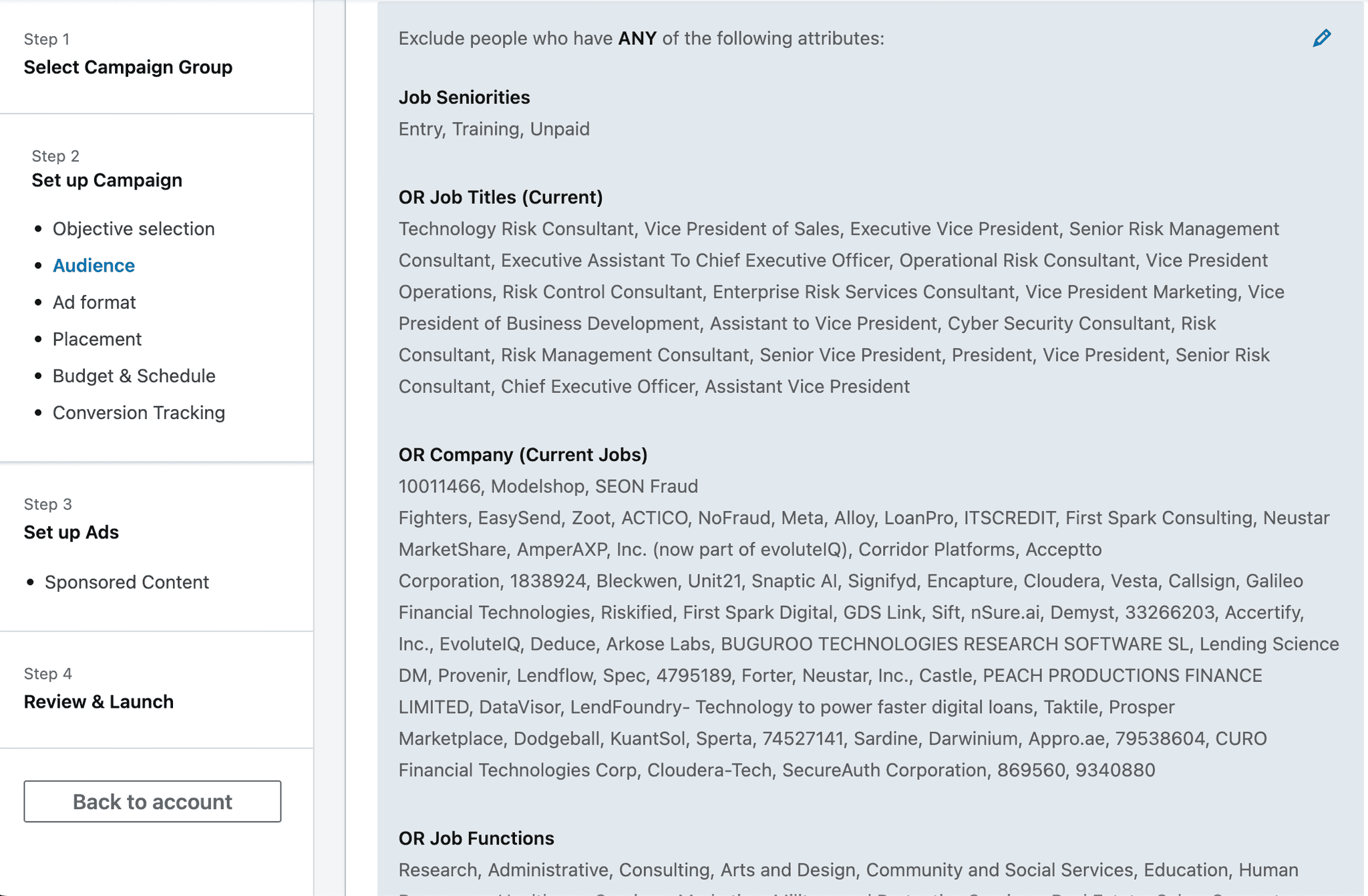 If you don’t exclude these levels of seniority from your campaigns, you’ll often find in your LinkedIn audience insights that a bunch of unpaid or entry-level employees are interacting with your ads.