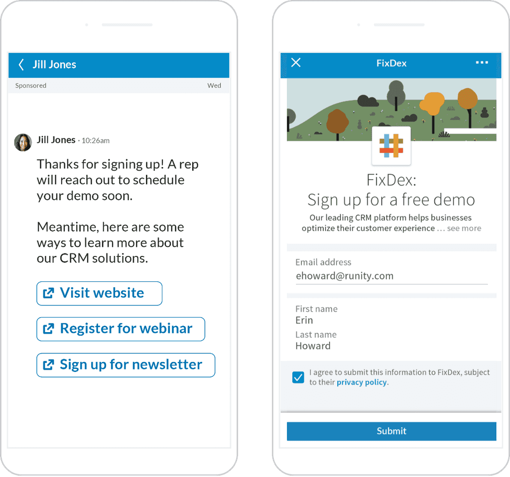 Lead gen forms are LinkedIn’s native forms that auto-populate user information and create a more seamless experience for the user because they don’t need to navigate off LinkedIn to fill out the form.